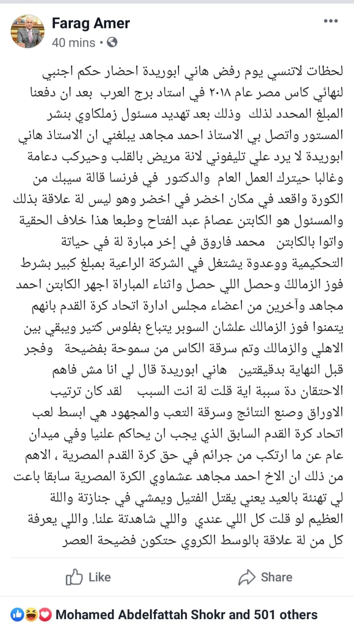 فساد: فرج عامر يحكي عن تواطؤ اتحاد الكرة لصالح الزمالك كاس مصر 2018فرج عامر رئيس نادي سموحة عبر فيسبوك تحرير هذه الصفحةهل اعجبك محتوى الصفحة؟تساعدنا ملاحظاتك على تحسين محتوانا. المقال السابقتفويت مباراة المصري 1992المقال التاليتفويت مباراة المصري 1992